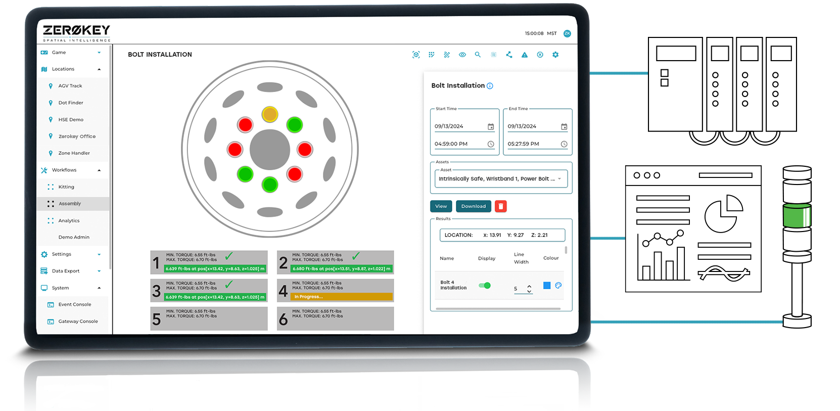 Use ZeroKey Workflows to enable live validation and tool control out of the box or connect through our API to stream spatial event data directly to your PLC, MES, or existing digital work instruction platform.