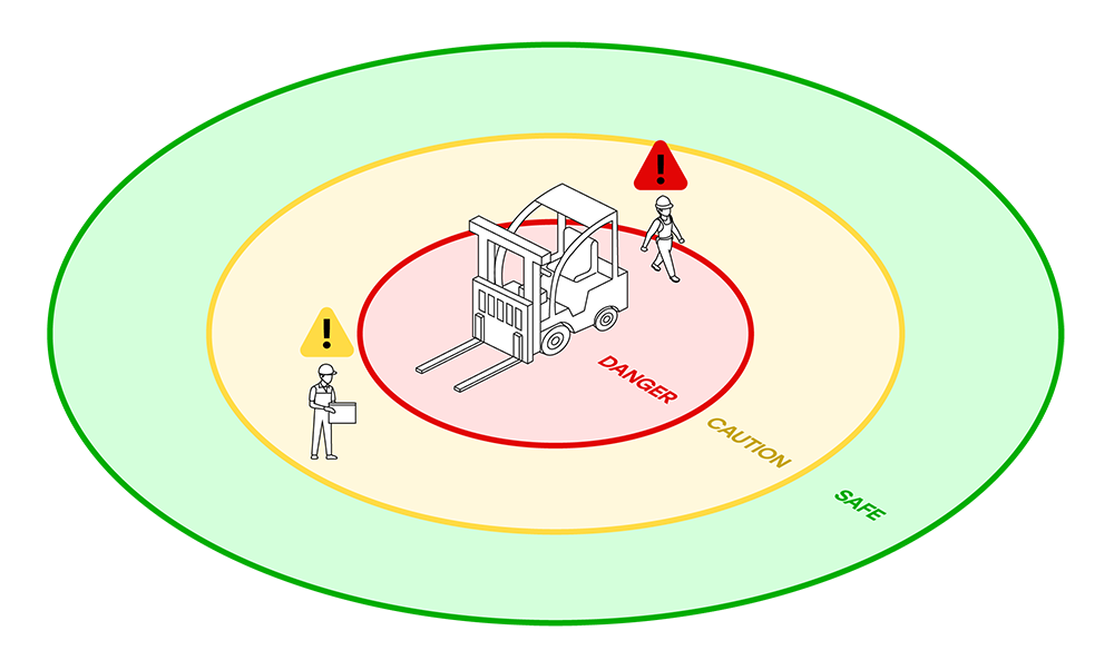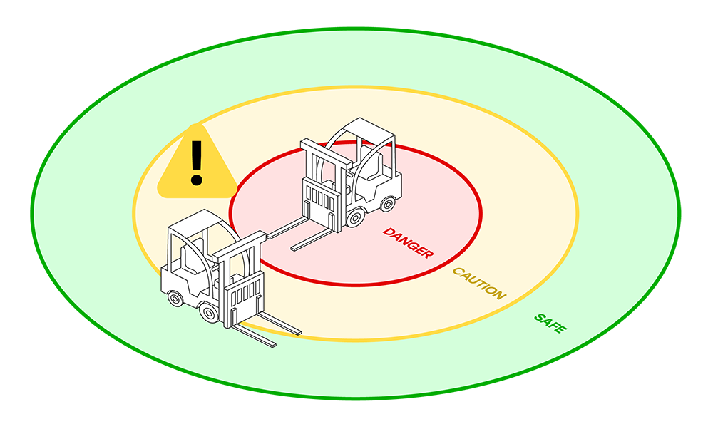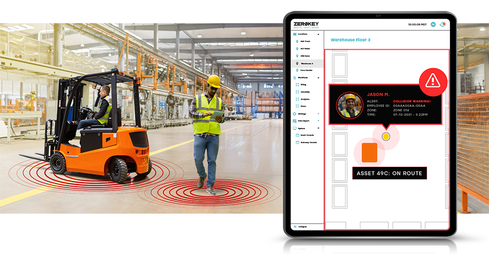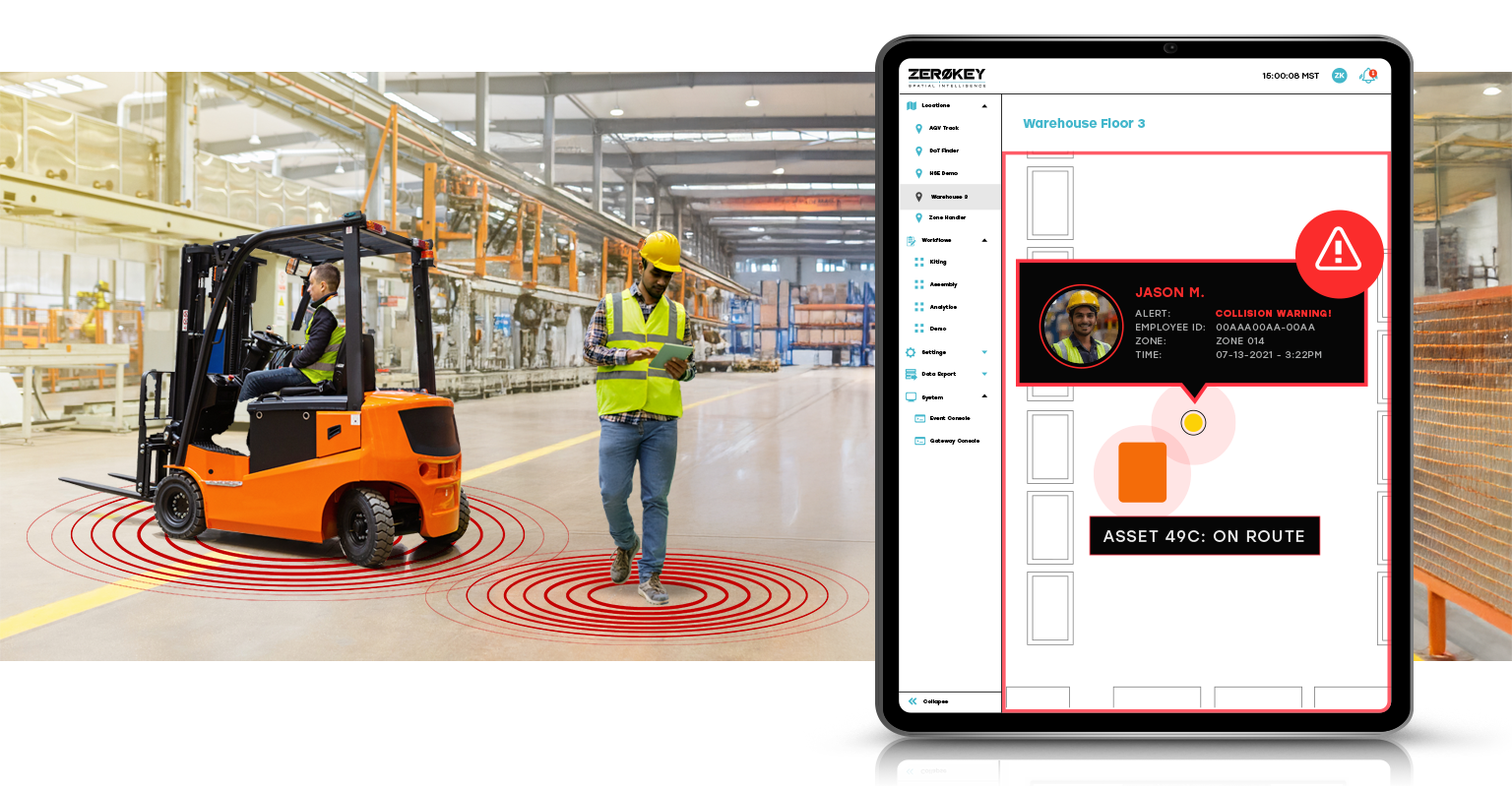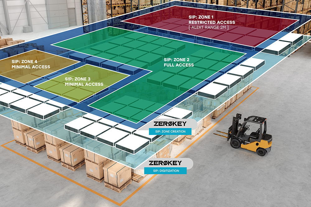 ZeroKey creates facility-wide dynamic 3D safety zones around equipment and pedestrians, automatically enforcing safety rules with real-time haptic and audible alarms when buffers are breached.