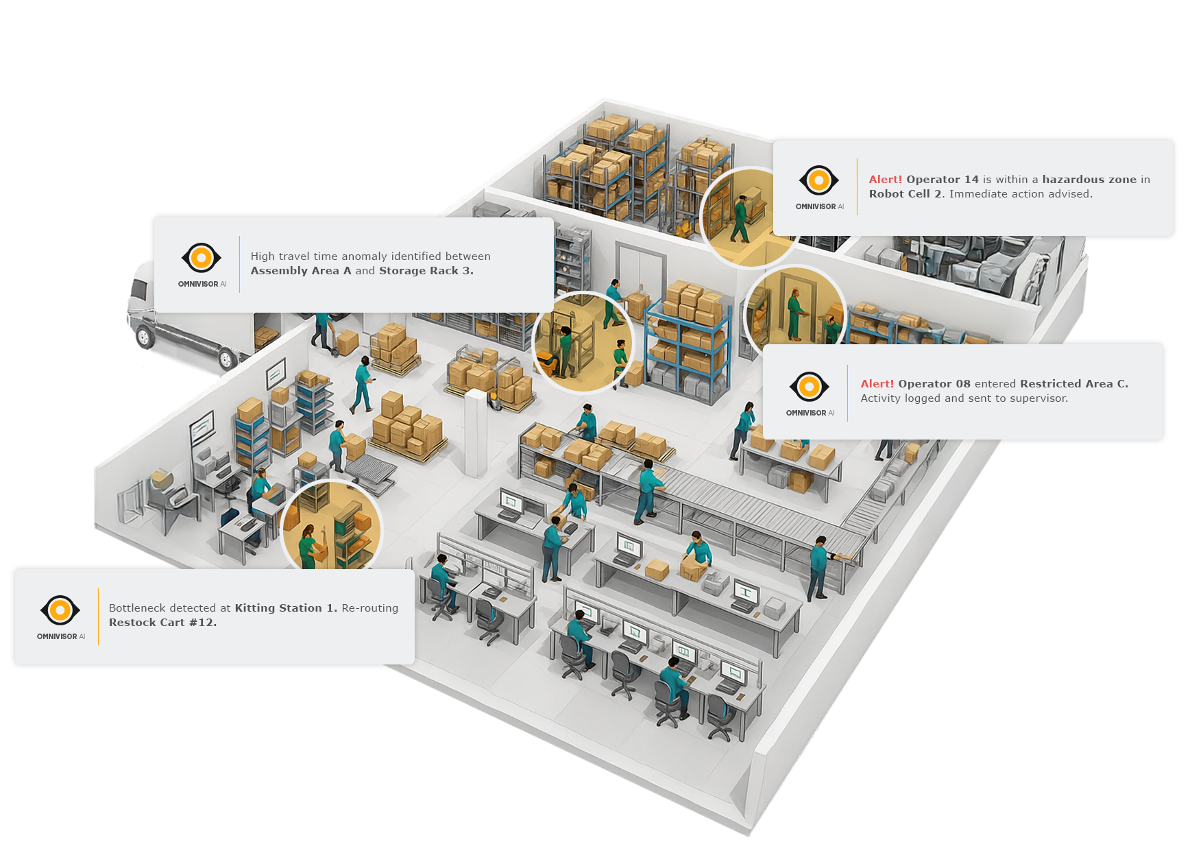 OmniVisor AI layers advanced process intelligence on top of contextually rich precise 3D location data, that is continuously analyzing every movement, interaction, and workflow in three dimensions.