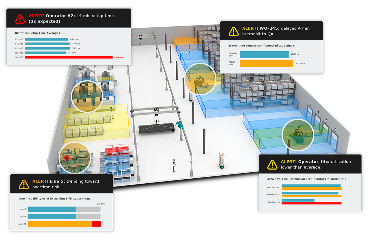 OmniVisor AI™ + Quantum RTLS™ capture labor activity in dynamic, real-world environments, not just linear production lines. In facilities where workers move between tasks and orders, every interaction is measured and contextualized, building a single source of truth for labor projections. From setup and transit times to actual work execution, every factor that impacts efficiency and profitability is visible in real time.