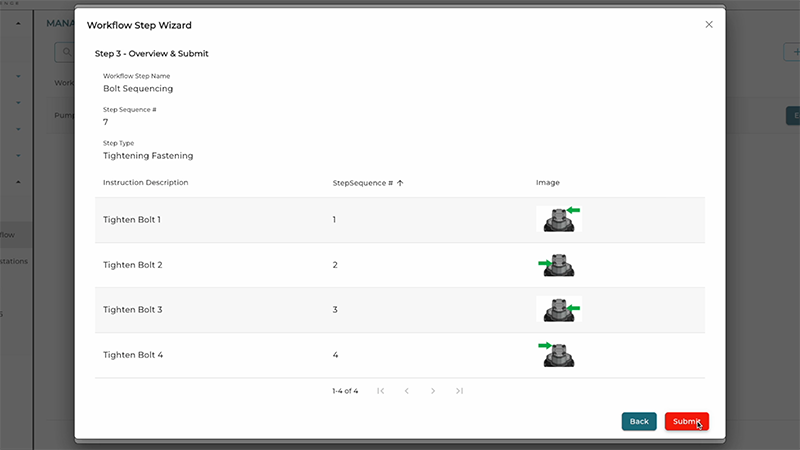 To begin, open the Workstation Operations page from the Workflows tab in the Dashboard menu, and select your Workflow. The onscreen instructions will load and advance in real-time as each step is completed. The system will also track step times and ensure accuracy by only advancing the instructions when a step is completed correctly. In the Workflow Calibration Wizard, optional alerts can be configured to display onscreen messages or external notifications if errors are detected. If a smart tool is integrated, it will be automatically locked out until it’s placed on the correct bolt in the sequencing process.