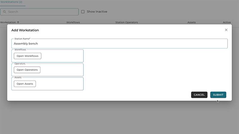 Workstations are a physical location in your environment where a Workflow will take place, such as an assembly bench or station. Workflows can be assigned to one or more Workstations, offering scalability and flexibility to apply standardized procedures to multiple locations where work may be completed. Navigate to the Manage Workstations page from the Workflows tab in the Dashboard menu. Click “+ Add Workstation” and fill in the form with the identifying information of your Workstation.