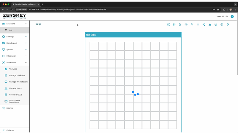 Power up your ZeroKey Edge Compute Device by plugging in the AC power supply, and connect the Gateway to it via the included USB-C cable. Access the Dashboard from a PC on the same network as the ECD (click here for more details about accessing your ECD’s Dashboard). Sign in with your user credentials and navigate to the Location View to view the real-time positioning of your Mobile. As you power up additional Mobiles, they will automatically start positioning and appear in the Location View.