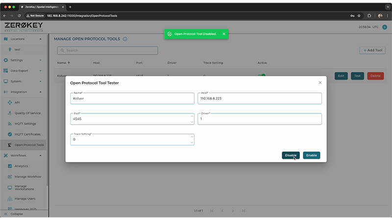 Connect your Torque Open Protocol smart tool to the same network as the ECD. Navigate to the Open Protocol Tools page from the Integration tab in the Dashboard menu. Click “+ Add Tool” and fill in the form with the tool’s name, IP address, and port. You can test the connection immediately using the built-in test commands to lock and unlock the tool.
