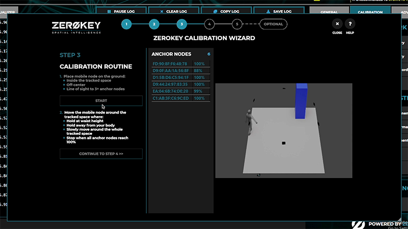 When the correct number of devices is displayed, place the Mobile face-up in the palm of your hand and with your arm extended at chest height, move slowly throughout the space where positioning is required. As you move, the system gathers necessary measurements for calibration. Ensure there is a clear field of view from the Mobile to the Anchors during this process. When complete, the onscreen status bars will indicate 100% and an alarm will chime. Click the “Continue” button. The system will then process the data automatically and determine the location of the Anchors relative to each other. For a more detailed overview of the calibration process, visit the ZeroKey Info Center.
